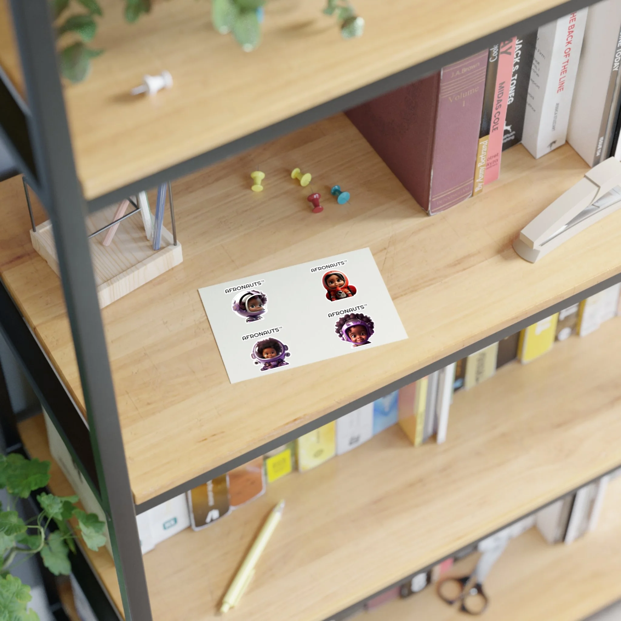 This is a single sheet of playful space-themed vinyl stickers featuring four charming cartoon children in colorful astronaut helmets. Each sticker shows expressive faces and rich, warm skin tones, with vibrant purple and red helmet accents that pop against the sheet. The matte laminate finish keeps colors soft while protecting against sun and wear, and the easy-peel backing makes it simple to decorate notebooks, laptops, tumblers, or planner pages. These water-resistant stickers are made from premium printable vinyl and are assembled in the USA using eco-solvent inks, offering long-lasting color and short-term outdoor durability. Note: white cannot be printed on transparent or holographic sheets, and very small, closely spaced details may be cut as one shape.